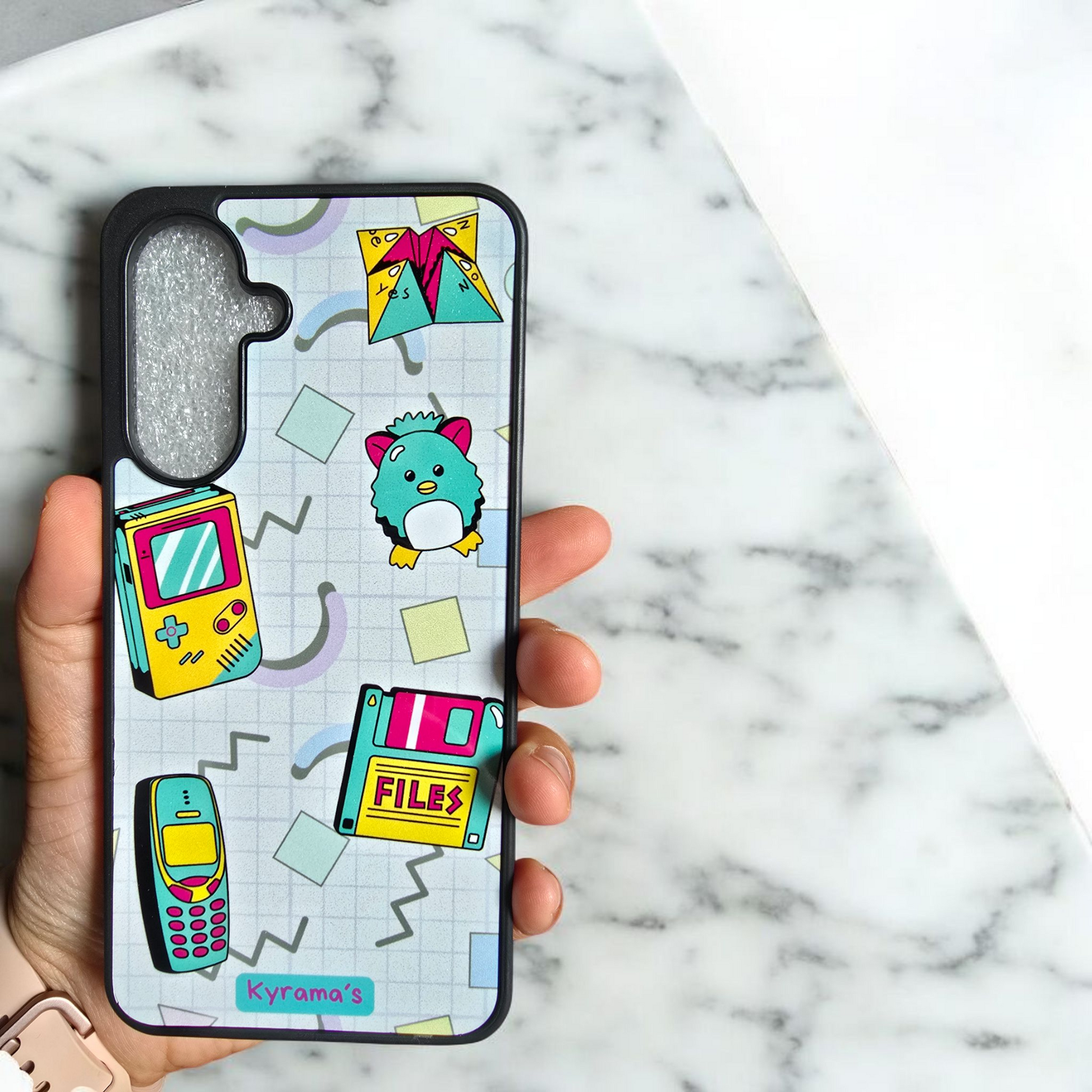 Krijg de perfecte bescherming voor uw telefoon met onze 90's telefoonhoes. Ontworpen om uw telefoon te beschermen tegen vuil, krassen en hobbels, biedt het ook gemakkelijke toegang tot alle knoppen en poorten. De aluminium achterplaat en TPU-rubberen randen bieden ultieme duurzaamheid, terwijl de ingesloten knoppen en verhoogde lip uw scherm beschermen. Vermijd het buigen en beschadigen van uw hoesje door het zorgvuldig te verwijderen en af te zien van het opslaan van objecten binnen. Met een levendig gesublimeerd ontwerp ziet uw telefoon er net zo goed uit als beschermd!